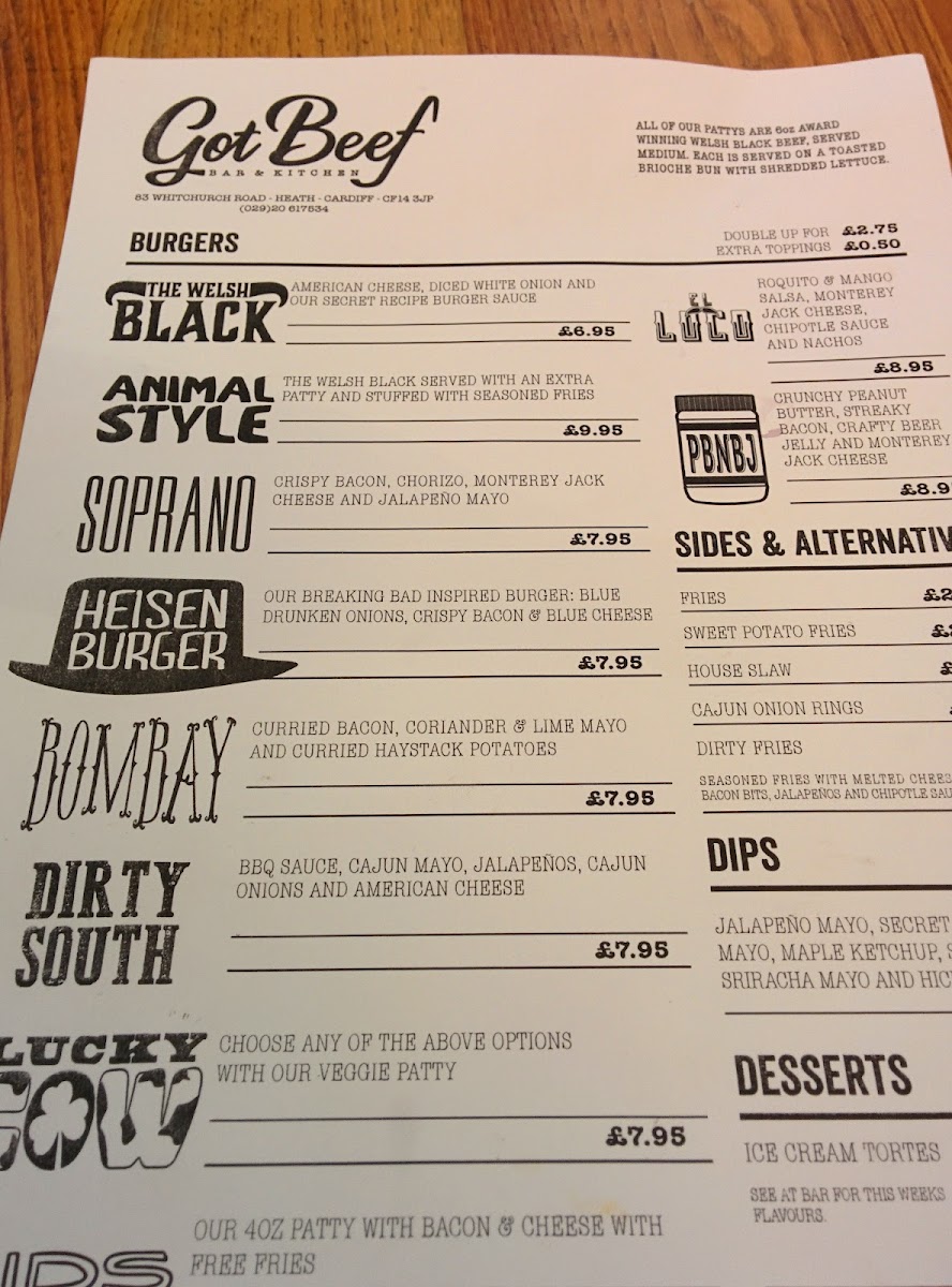 Introducing the menu at Got Beef, a culinary gem located in Cardiff, offers a delightful range of burgers that cater to every palate. The lineup features signature gems like the Welsh Black (£9.00) and the indulgent Hangover (£12.75), alongside quirky options like the Pbnbj (£10.00). With each burger crafted to perfection, the quality speaks volumes; patrons rave about their juicy patties and vibrant flavors.